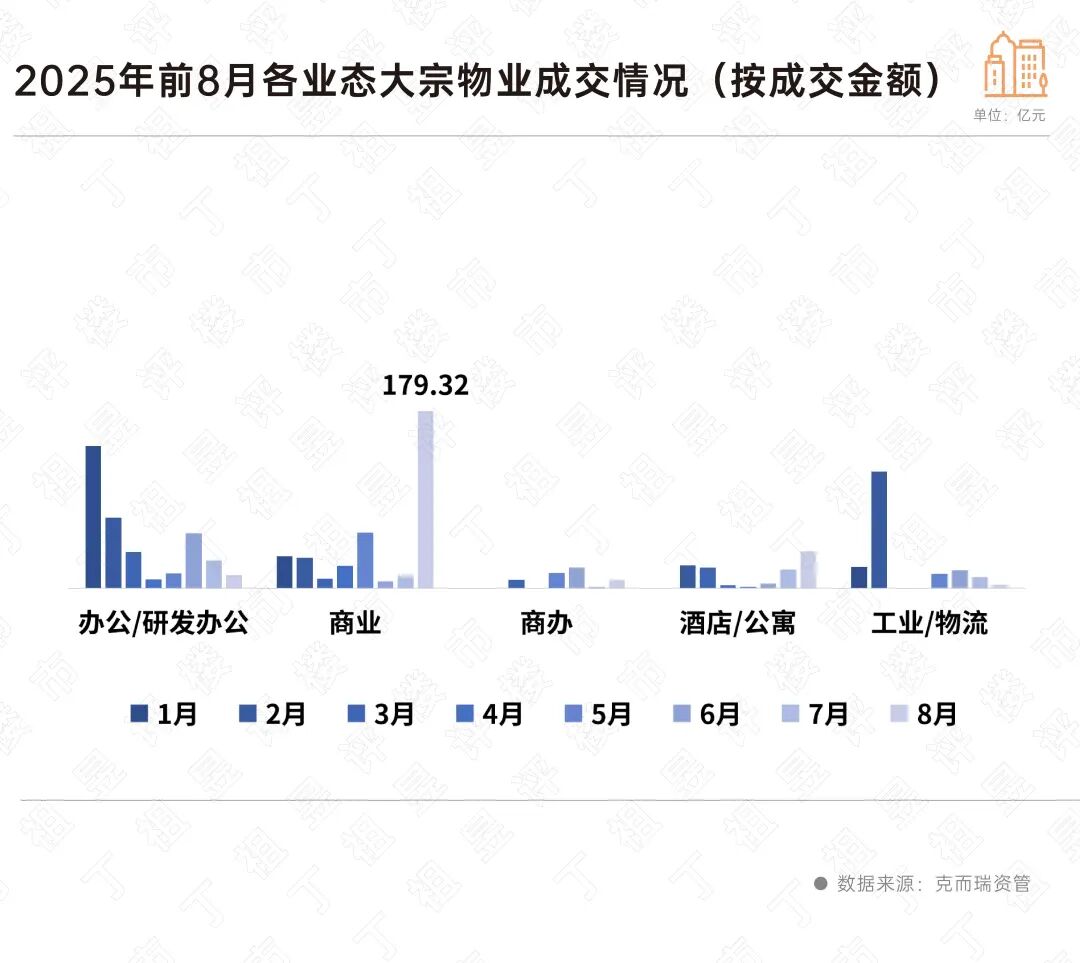 从投资业态偏好来看,8月零售商业相关大宗成交规模接近180亿元,占比超7成,前8月累计成交规模达到351.7亿元。