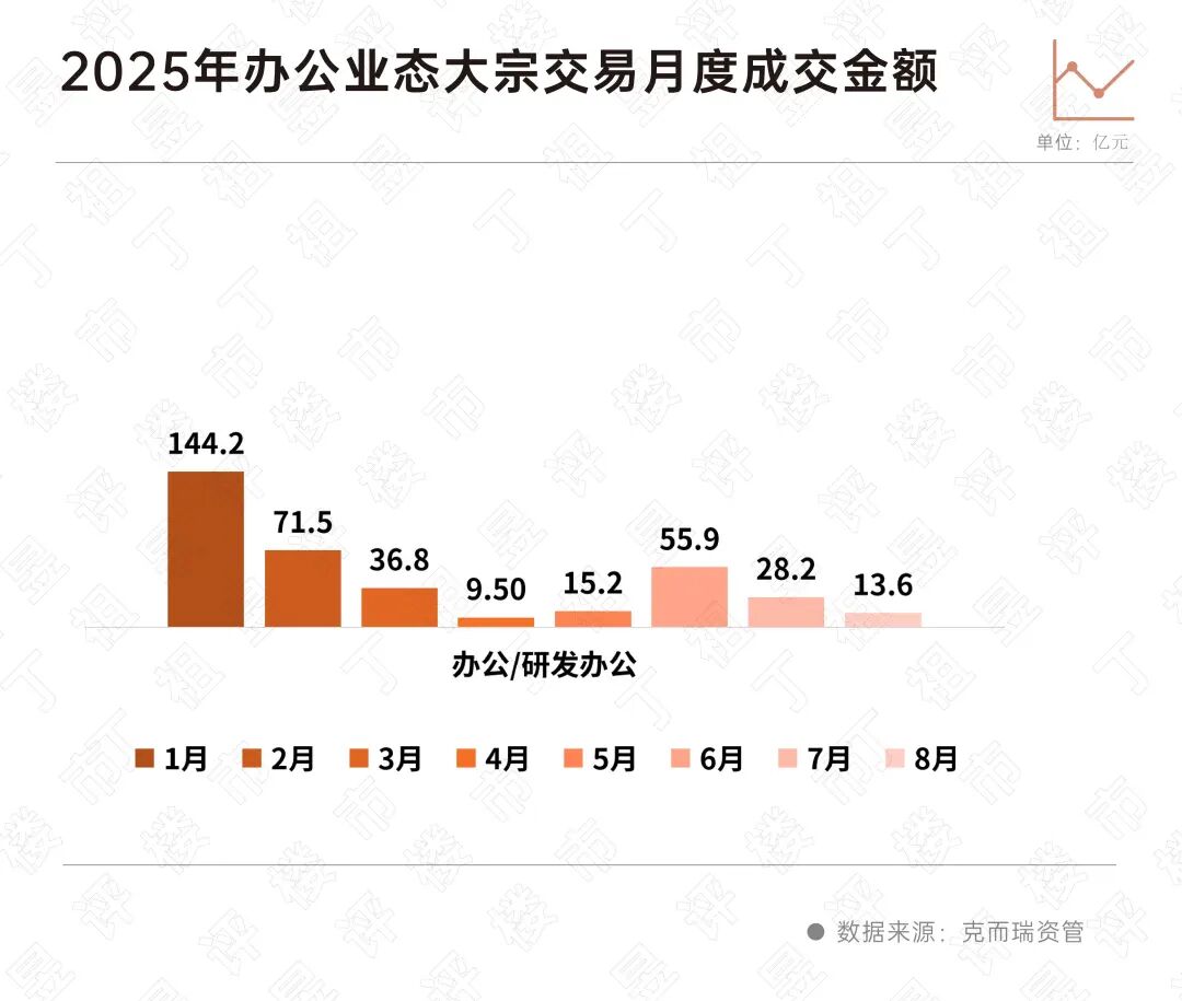 不过,下半年以来,写字楼相关的大宗交易日趋冷清。总体呈现交易规模收缩、活跃度显著下降态势,据克而瑞资管统计,今年一季度办公相关大宗交易成交金额超200亿元,二季度约80亿元,三季度前两个月仅有约42亿元,交易活跃度降至近年来的低点。