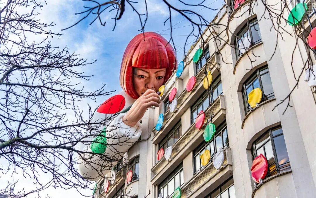 同样沉迷“微物巨化”的还有顶级奢侈品大牌LV。2023年,LV与日本艺术家草间弥生合作期间,在巴黎香榭丽舍大街旗舰店外墙设置了巨型草间人像装置。过去几年,它还多次将巴黎、纽约的旗舰店改造成巨型LV旅行箱。今年,这一手法又被复制到上海静安兴业太古汇前,长114.5米、高30米的LV巨轮成为社交平台的必打卡地标。