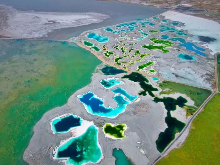 这里氯化钾资源极为丰富,是全国最大的钾镁盐矿床。五颜六色的湖水中还伴生着镁、锂、硼、碘等多种矿产。