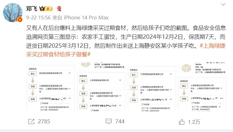 据前调查记者、微博大V邓飞爆料上海绿捷采买过期食材,然后给孩子们吃。其表示,食品安全信息追溯网页第三图显示:农家手工蛋饺,生产日期2024年12月2日,保质期7天,而进货日期2025年3月12日,然后制作出来送上海静安区某小学孩子吃。