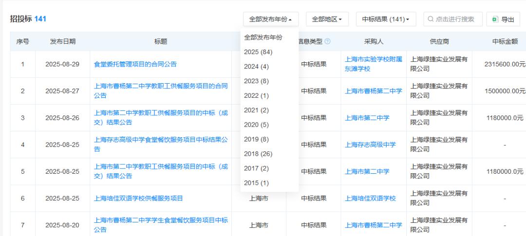 资料显示,上海绿捷成立于2014年,2017年便已服务331所中小学、日供36万份餐食,到2024年更是扩张至覆盖500多所学校及幼儿园,日供餐量突破50万份,占据上海近三成校园配餐份额。2025年8月单月,上海绿捷更是一口气中标27个项目,将上海市第二中学、华东师大附属外国语实验学校等名校纳入服务清单,中标公告里清一色写着“方案详实、预案齐全”,看似无可挑剔。