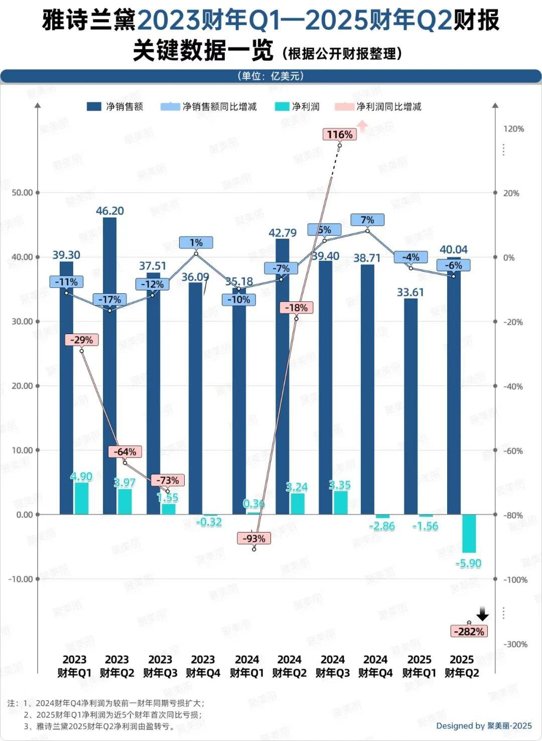 尤其是2025财年Q4(2025年4-6月),雅诗兰黛销售额为34.11亿美元(约合人民币243.42亿元),同比下降12%;而净利润亏损高达5.46亿美元(约合人民币38.97亿元)。