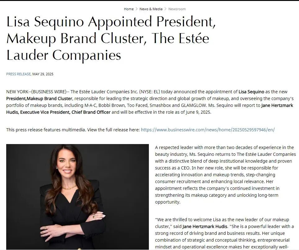 除上述高管的上任外,雅诗兰黛还在今年5月官宣召回9年老将Lisa Sequino,回归集团担任彩妆品牌集群总裁。(详见)