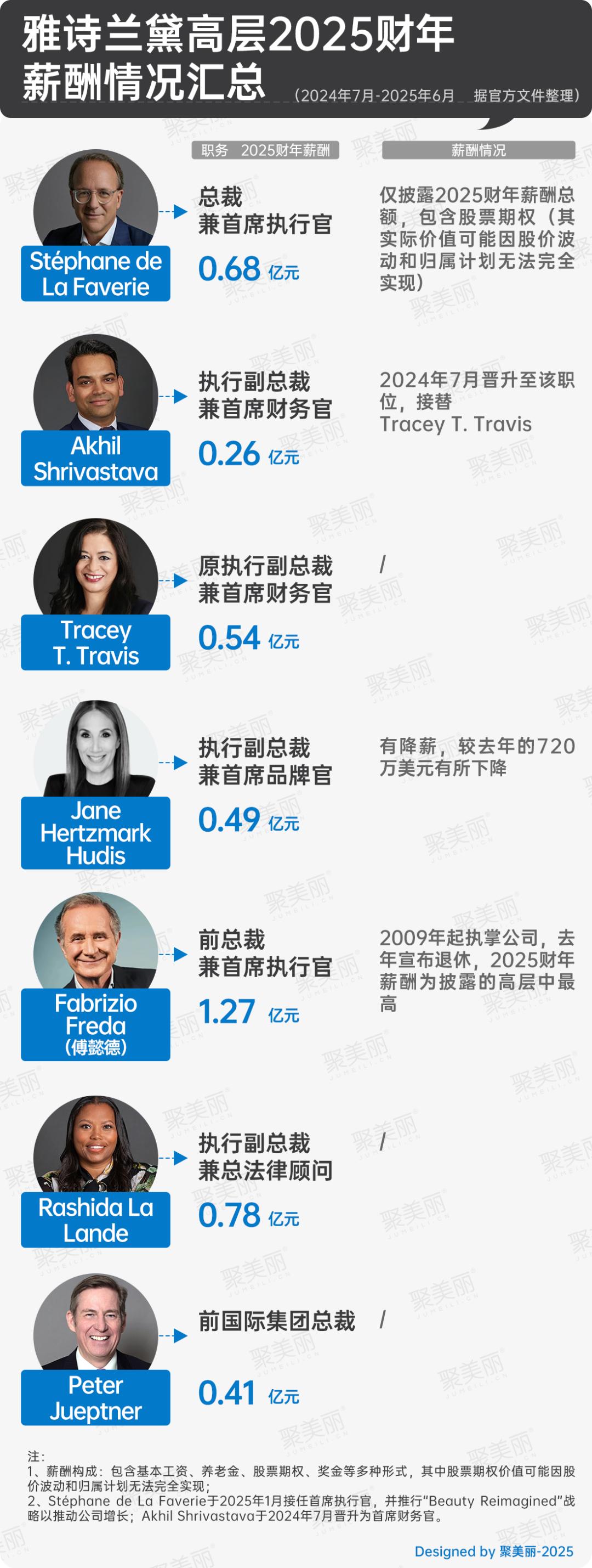文件显示,雅诗兰黛2025财年管理层中,薪酬最高的高管为前总裁兼首席执行官Fabrizio Freda(下文称“傅懿德”),2025财年总薪酬累计达1780万美元(约合人民币1.27亿元)。
