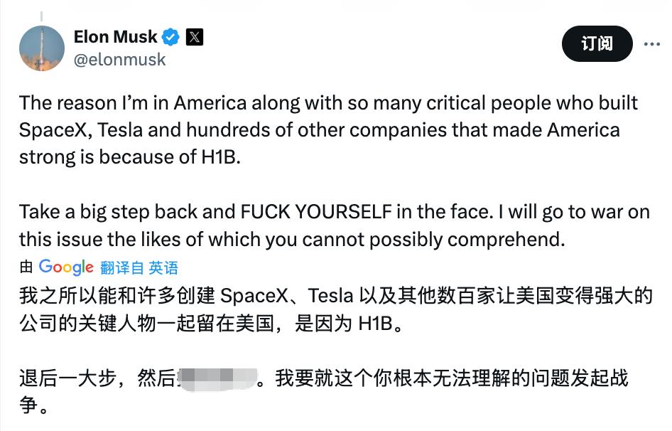 去年年底,马斯克还曾公开表示要为H-1B“开战(go to war)”,与一批强硬派保守人士(包括班农阵营)发生公开交锋。他强调自己之所以在美国,和创建SpaceX、Tesla以及其他公司的关键人物并肩,是因为H-1B,甚至一度在X上大骂脏话。