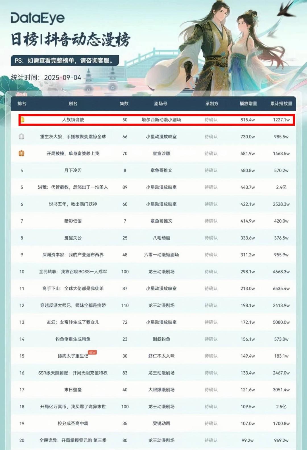 塔尔西斯动漫和乾多多剧场,均在今年7、8月份探索上线了首部纯AI作品。塔尔西斯动漫技术负责人江文杰表示:「7月初时决定用AI实操,8月份《人族镇诡使》上线抖音,后登顶9月4日抖音动态漫日榜,自然流跑出1127万播放。」