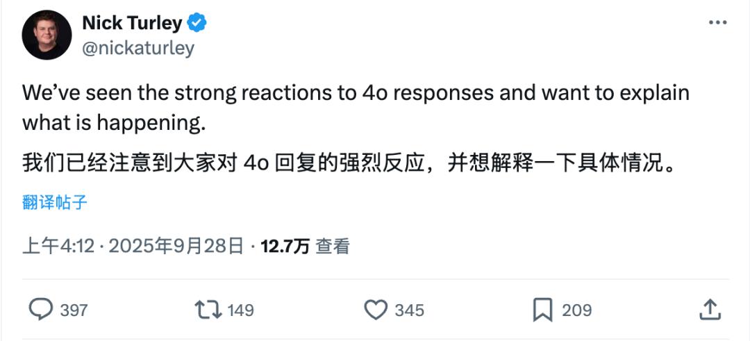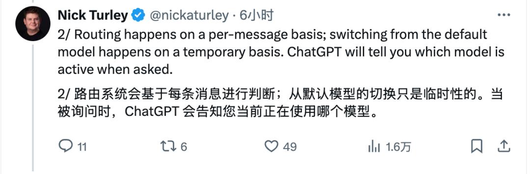 Nick Turley表示目前从默认模型切换到敏感模型只是临时性的。
