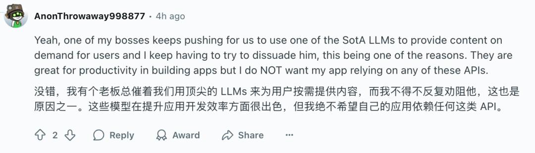 也有表示,他的老板总是想用最顶级的LLMs提供服务。