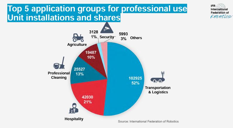从专业服务机器人的应用领域分布看,运输与物流领域占据绝对主导地位,安装量达10.29万台,占比高达52%;