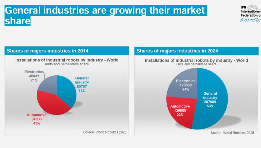 应用领域上,通用行业表现强劲,工业机器人安装量占比从2014年的36%飙升至2024年的53%,弥补了汽车行业的疲软,成为应用主导领域;