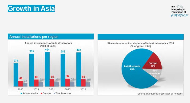 区域分布上,亚洲/澳大利亚地区2024年工业机器人安装量达40.2万台,在全球工业机器人安装量中占比高达75%;