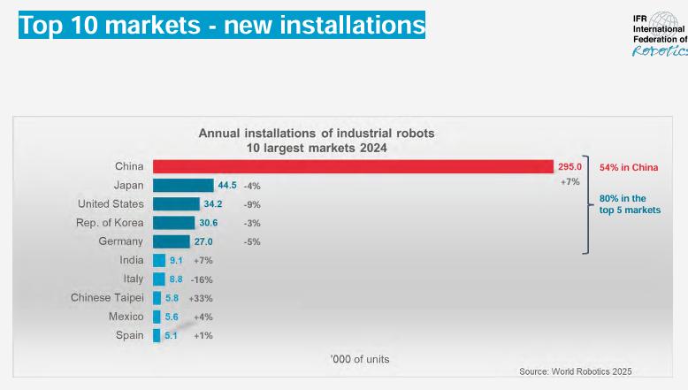 中国作为全球最大的工业机器人市场,2024年表现亮眼,安装量达29.5万台,创下历史新高,占全球部署量的54%;