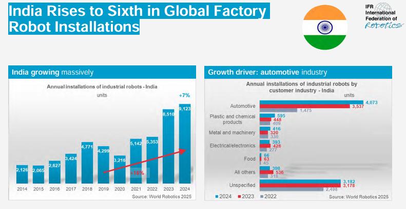 与传统市场的疲软形成鲜明对比,印度工业机器人产业展现出强劲的增长态势,其工业机器人安装量全球排名仅次于德国,上升至第六,从2014年的2126台起步,到2023年已达8510台,2024年更是进一步增长至9123台,同比增长7%,其中2021年同比增速高达16%,增长势头迅猛。