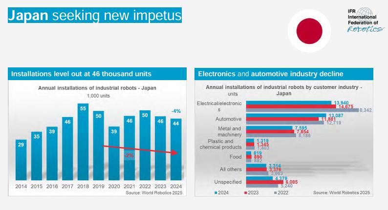 其他主要市场则呈现不同程度下滑。日本维持全球第二大工业机器人市场地位,2024年安装量4.45万台,同比下降4%;