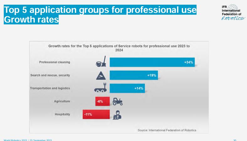 各应用领域增长表现则呈现明显分化。2023-2024年,专业清洁领域增长最为显著,达34%;搜索救援与安全领域增长19%,运输与物流领域增长14%。三者构成主要增长动力。