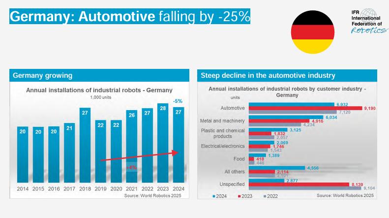 德国作为欧洲最大、全球第五大工业机器人市场,2024年安装量下降5%至2.70万台。