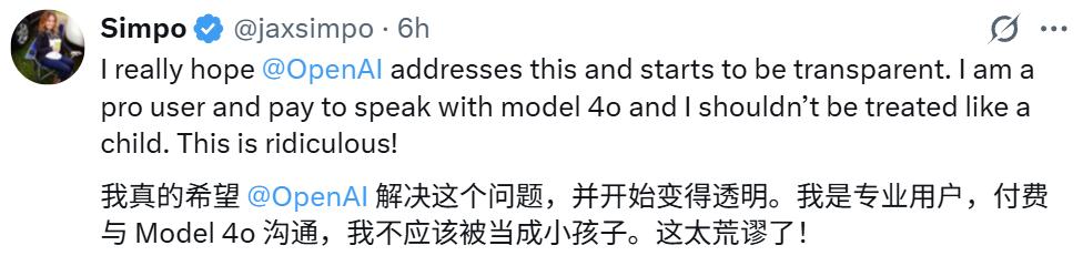 他进一步解释说:「无论你说什么都无关紧要。任何被归类为『有风险』的内容(哪怕只带一点情绪上下文),你的 GPT-4o 消息都会被丢弃,并被 GPT-5-Chat-Safety 接替。」