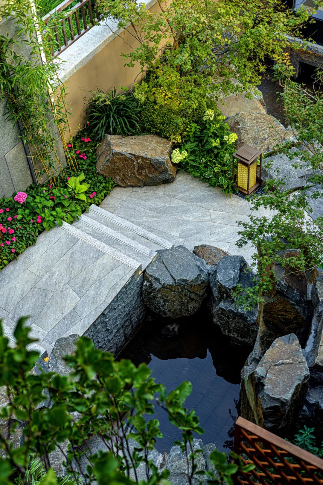 推开私家院落之门,繁茂绿植忽入眼帘,又见十五级石阶嵌入半山地形,自台阶而下,初识叠石飞涧的写意之美,越过流水潺潺的听泉石桥,檐角轻盈而翘的枕溪亭榭又成为眼前之景,繁花点缀下,每一眼,都是独特的风景,每一寸时光,都蕴藏诗意与闲雅。