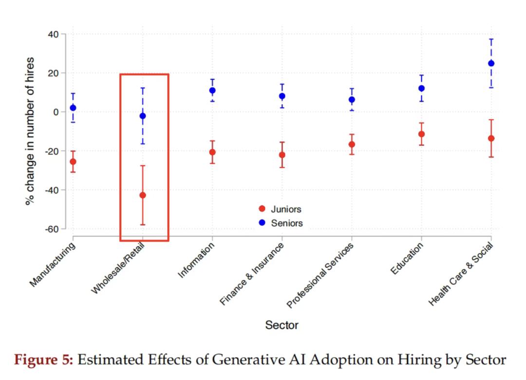 但最惨的其实是批发零售业。因为这个行业的初级岗位,大多是文员、客服、导购,正好是AI最擅长替代的。结果就是,拥抱AI的零售公司,比不用AI的同行,每季度少招40%的新人,招聘直接砍半。