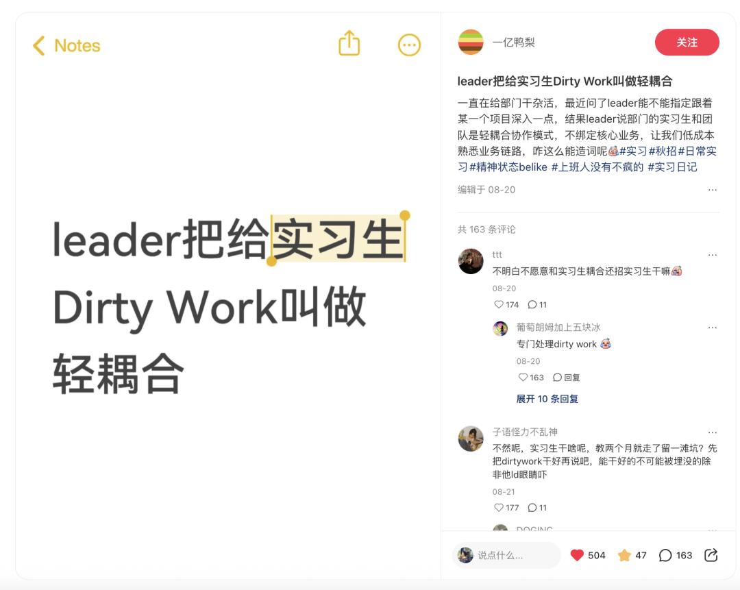 这套系统运转的受益者当然是公司,他们可以用极低的成本,把团队里没人愿意干的活包装成学习机会,顺理成章地转移给实习生。