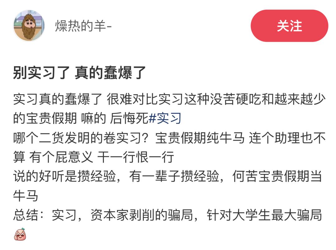 更倒霉的是,除了实习生本人,0人会理解他们的痛苦。