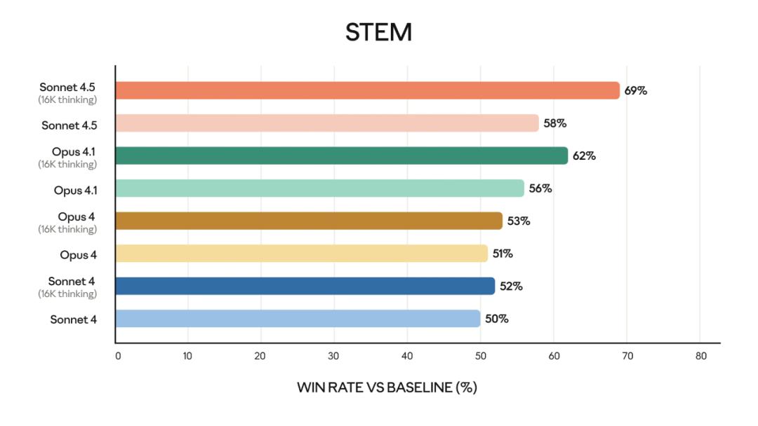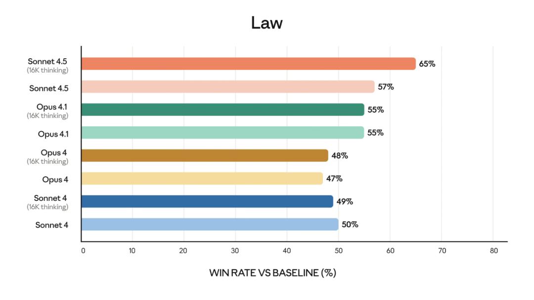 推理与数学:在一系列公共评测中大幅领先,特别是在金融、法律、医学和STEM等专业领域的知识与推理上,远超此前的Opus 4.1。