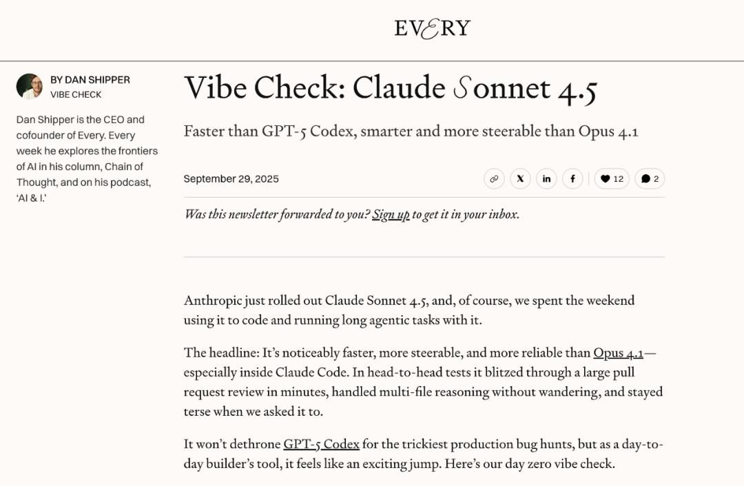 知名测评博主Dan Shipper 则表示,新版 Sonnet 4.5 在使用体验上响应速度更快,可控性更强,也更稳定。