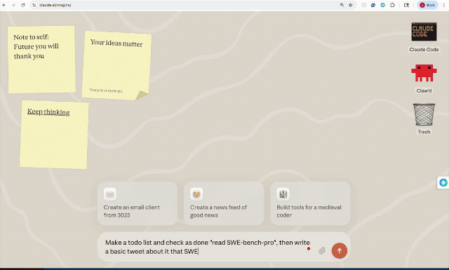 比较让我感兴趣的是,Anthropic 还在 Claude Sonnet 4.5 发布的同时推出了个临时研究预览功能,叫「Imagine with Claude」。