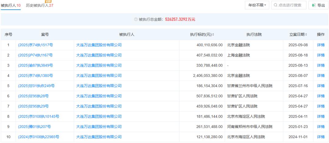 根据天眼查信息,万达集团有10条被执行人信息,被执行总金额达52.63亿元,执行法院包括北京金融法院、上海金融法院、兰州市中级人民法院、郑州市中级人民法院等,单笔执行金额均在1亿元以上,最大一笔超过24亿元。立案时间集中在2025年。