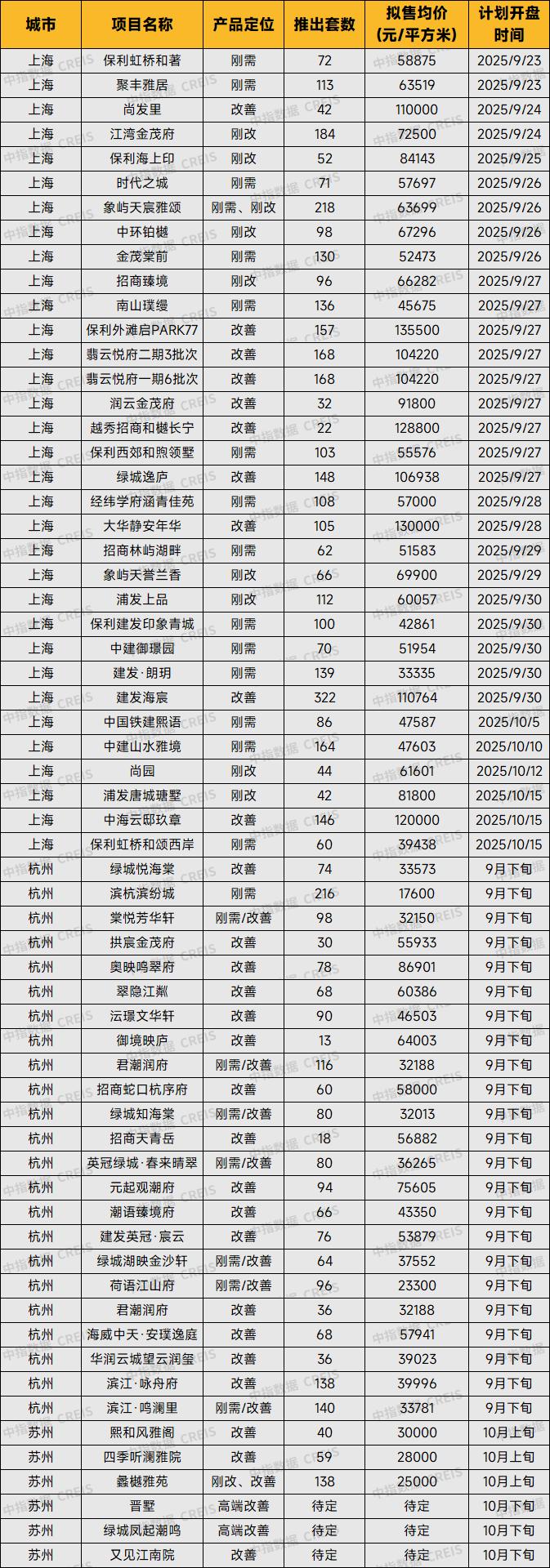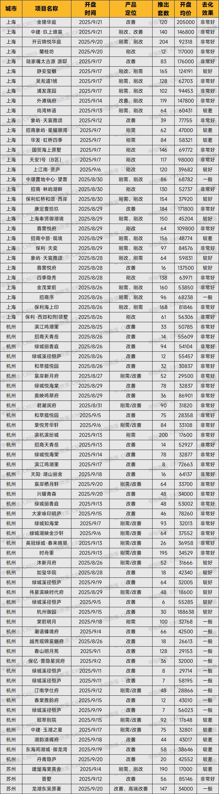 根据中指监测,2025年8月25日-9月21日,房企推盘积极性提升,华东大区重点城市上海、杭州、苏州3个重点城市累计79个项目开盘,推出房源6259套,环比增长87.5%。其中,上海的外滩瑞府等19个项目,杭州的绿城丽香庭等19个项目,由于区位优势、周边配套丰富、通达性好等原因实现开盘热销,去化效果非常好。