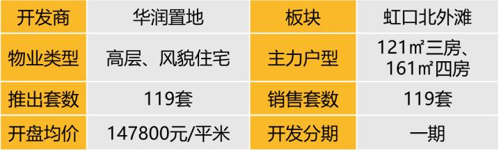 认购去化:外滩瑞府已于9月14日开盘,本次共计推出119套房源,主力户型为121/161㎡三、四房,均价147800元/㎡,一房一价,目前房源已售罄,去化率100%。