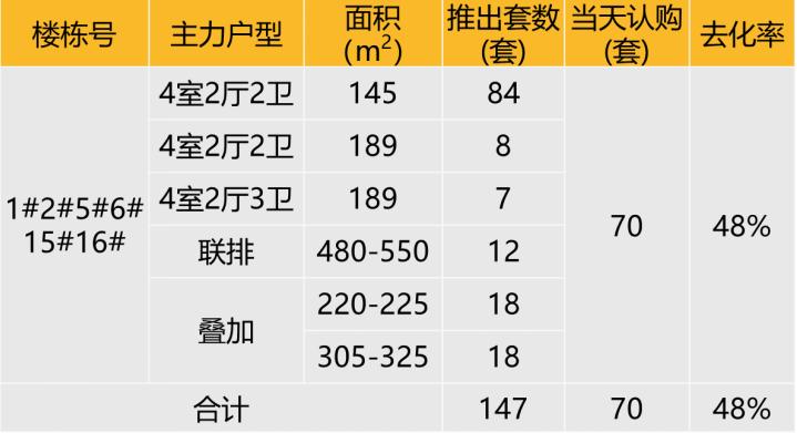 认购去化:2025年9月20日本项目推出毛坯联排6#、精装11F洋房15/16#,精装四代8F洋房1#,毛坯4F叠加2/5#,共计147套,开盘认购70套,去化率48%。