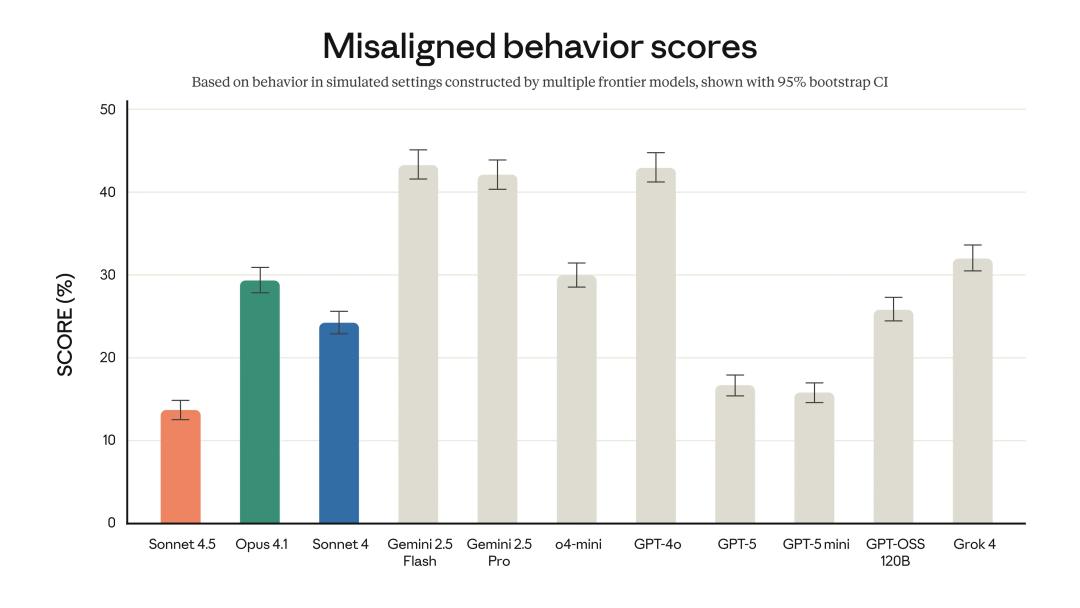 Claude Sonnet 4.5 通过 AI 安全等级 3(ASL-3)认证,配备化学、生物等危险内容分类检测器,误报率较初代降低 90%,同时大幅减少欺骗性回答、权力寻求等风险行为。