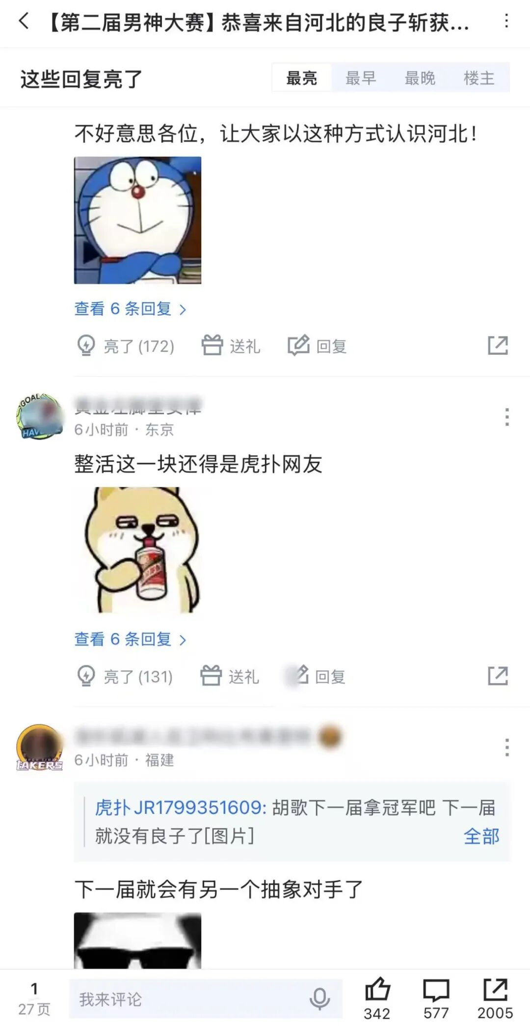 虎扑第二届男神大赛总决赛对阵中,万万没想到,体重350斤的美食博主良子以“不被定义的美”在决赛中击败胡歌拿下冠军。