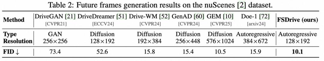 在 128×192 分辨率下,FSDrive(自回归)FID=10.1,优于多数扩散式世界模型(如 GEM 10.5)并显著优于 Doe-1(15.9),兼顾实时性与质量。