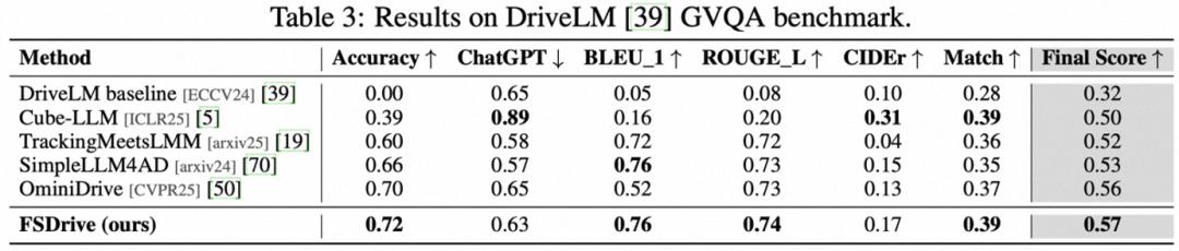 Final Score 0.57,超过 OminiDrive(0.56)、Cube-LLM 等;多项语言生成指标与多选准确率(0.72)均表现稳健,表明 “理解 + 生成” 统一预训练的有效性。