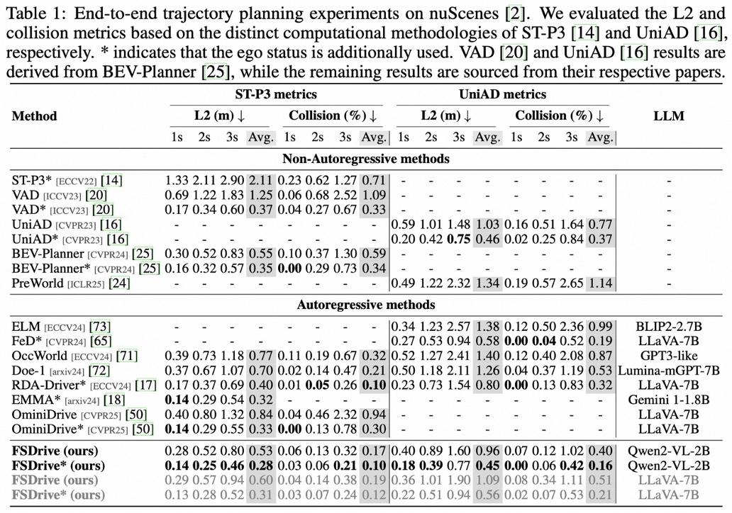 - ST-P3 平均 L2:0.53 vs 0.70;碰撞率:0.19 vs 0.21(基于 Qwen2-VL-2B)。