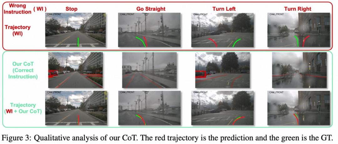 在错误导航指令下,FSDrive 可通过 “观察 + 未来预测” 的视觉推理纠偏路径,降低潜在碰撞;体现其 “逆动力学” 能力与可解释性。