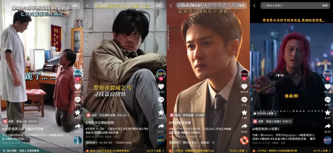 比如在喜剧《浪浪人生》中,短视频营销策略注重强化合家欢喜剧氛围;《毕正明的证明》则将重心放在了奇观感与反扒题材新鲜感的营造;《震耳欲聋》借主演檀健次的人气做加成,同时深挖现实话题;而全明星局《刺杀小说家2》,则专注明星阵容与头部制作,主打稳扎稳打。