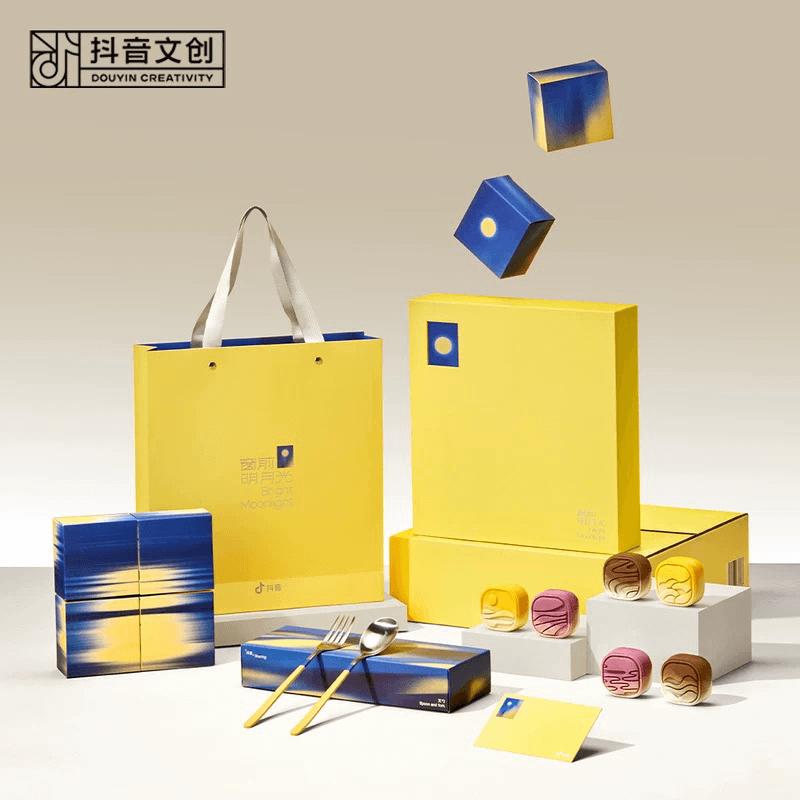 今年,抖音中秋礼盒选取了黄蓝色调,如同一方月光与夜色。小小的镂空方框映出“窗前明月光”,把“天涯共此时”的佳节之思传递到现代生活。