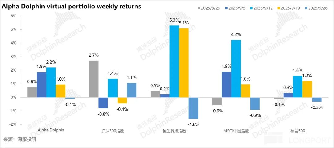 上周,海豚投研的虚拟组合 Alpha Dolphin 未调仓。当周下行 0.1%,跑输沪深 300(+1.1%),但跑赢 MSCI 中国指数(-0.9%)、恒生科技指数(-1.6%)、标普 500 指数(-0.3%)。