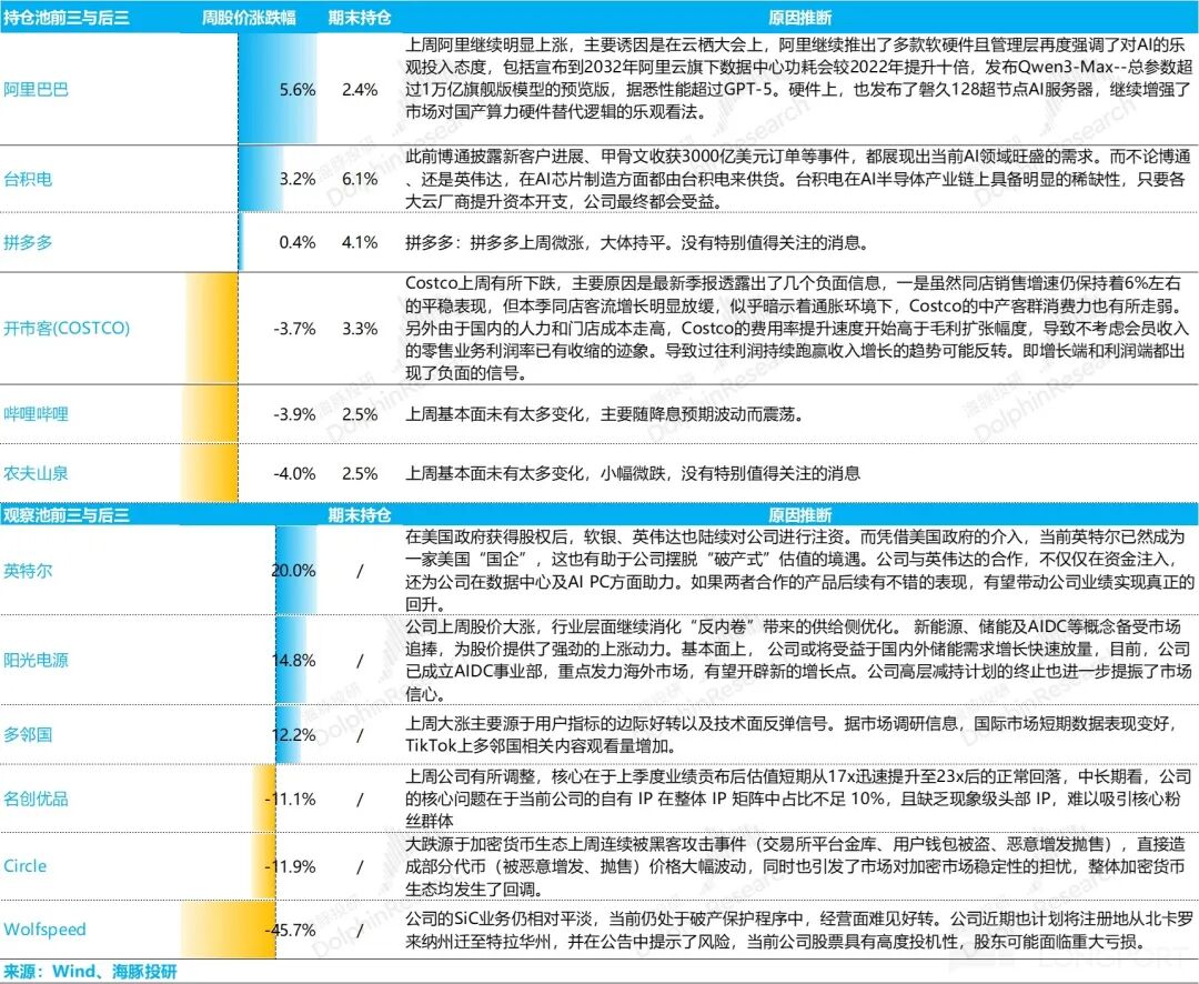 上周海豚君的虚拟组合 Alpha Dolphin 下跌主要因网易、B 站等中概资产回调,同时美股如 Costco 因业绩走弱,拖累权益资产表现,但组合中的黄金权重因美国政府关门风险而上升,对冲掉了权益资产的回调。