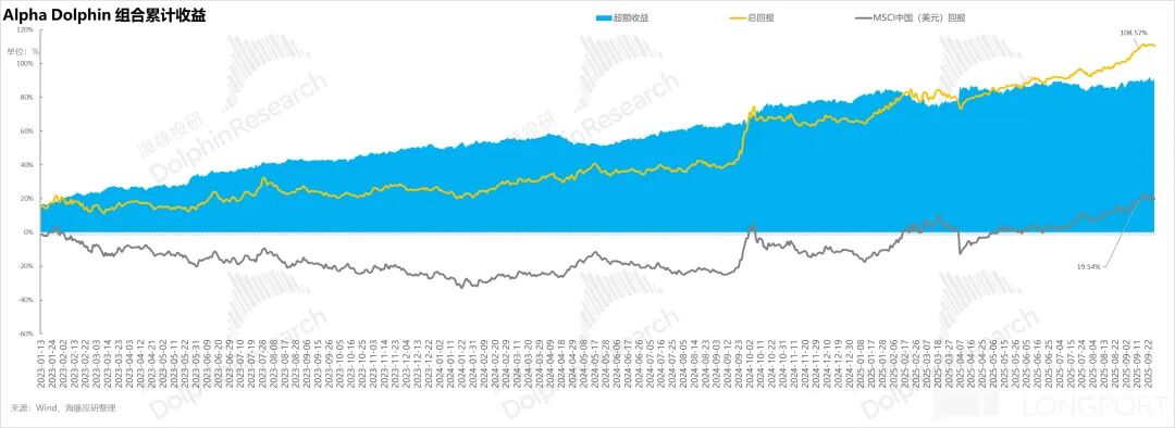 自组合开始测试(2022 年 3 月 25 日)到上周末,组合绝对收益是 110%,与 MSCI 中国相比的超额收益是 90.8%。从资产净值角度来看,海豚君初始虚拟资产 1 亿美金,截至上周末超过了 2.15 亿美金。