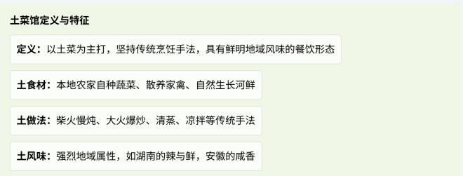 因此,现代改良土菜馆的本质,是以现代餐饮管理方法重新诠释乡土美食。在保留“土”基因的同时,通过供应链优化、工艺标准化、空间场景化、传播内容化、运营体系化五大手段,实现从“农家土菜”到“精致土菜”的升级。