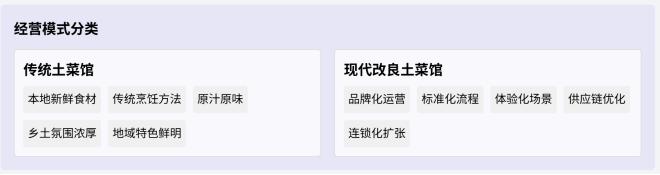 前者基于地方菜系体系,主要覆盖地方都市圈范围内的饮食支系,核心是以“土”为主题,包括土灶、土菜、土屋等元素,营造出浓厚的乡土氛围。后者则是在保留土菜核心元素的基础上,进行多方面升级改良。
