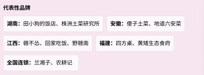 此外,还有湖南的“田小狗的饭店”“山坡上的小炒”,安徽的“傻子土菜”“陈家味土菜馆”“地道六安菜”,江西的“黄矮生态食府”“叶满厨”等品牌,共同推动土菜馆业态持续升温。