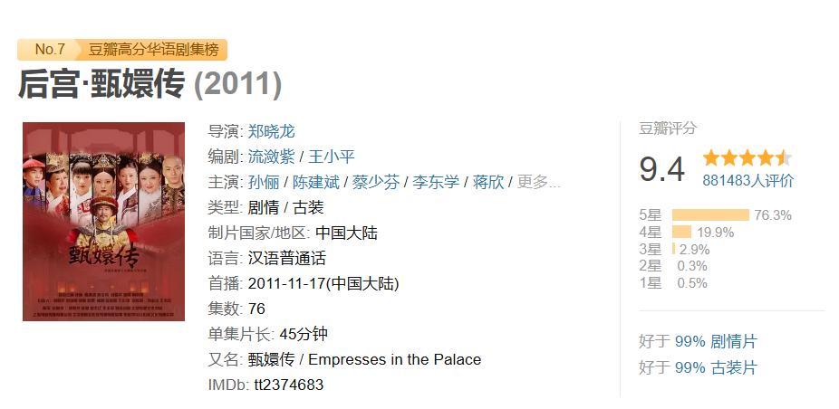 《甄嬛传》这部剧在豆瓣的评分高达9.4。(图/豆瓣)