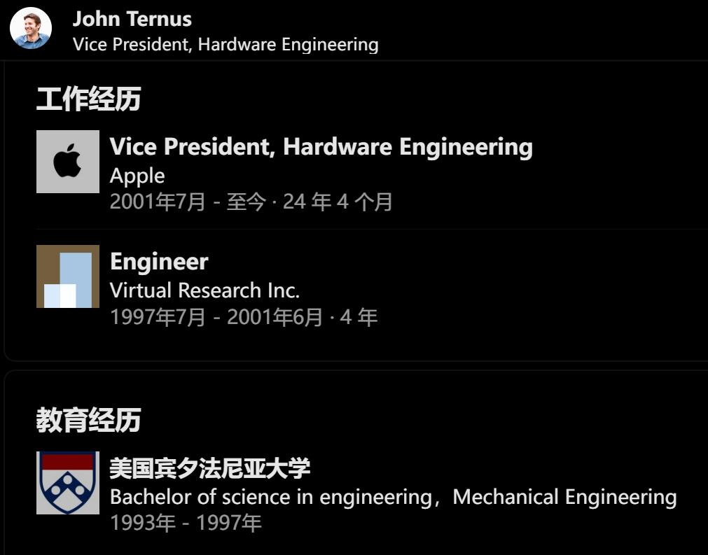 John Ternus毕业于宾大机械工程专业,2001年加入苹果,已经是一名入职近25年的老将了