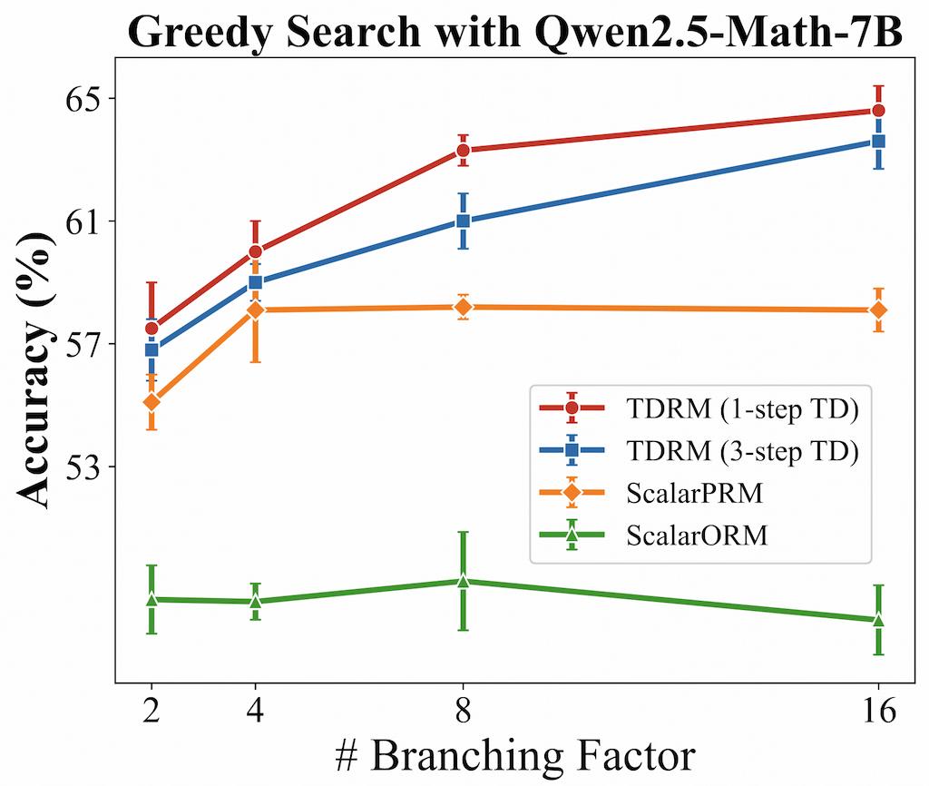 在树搜索评估中,TDRM 再次展现出更优的性能,并提供了更准确的推理轨迹验证。并且,TDRM 的准确性随着搜索分支数量的增加而提升,体现出它在复杂决策空间中导航的有效性。